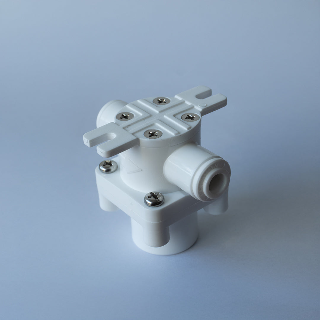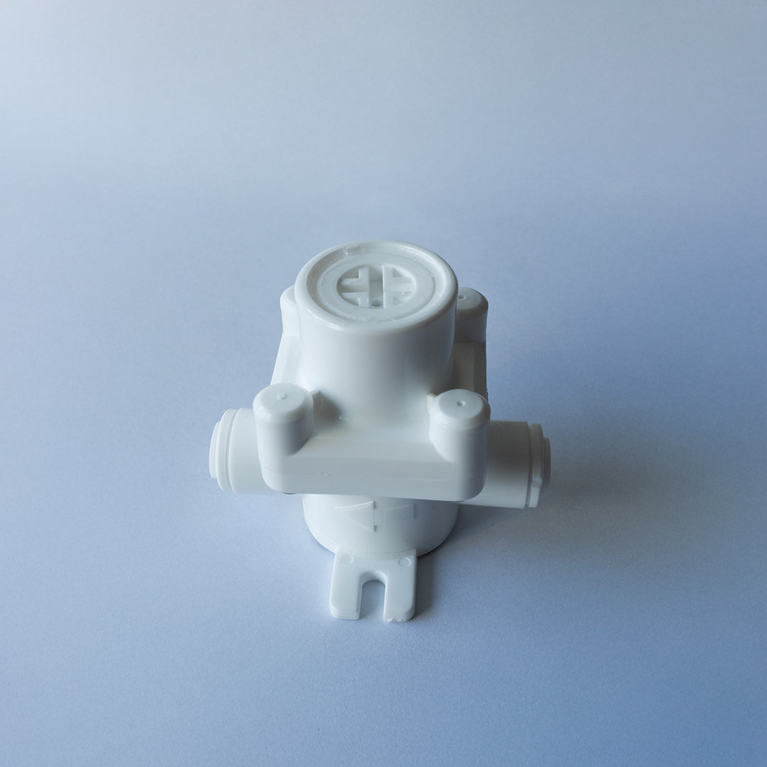 (Como el lavaplatos) - La máquina utiliza una válvula de reducción de presión (Incluida en el kit de instalación).Que permite a la máquina trabajar con la presión indicada. Conecta la válvula en la manguera de admisión (in) a una palma de distancia desde el flexible, cortando la manguera con un tip top y conectando la válvula con la flecha hacia la máquina.